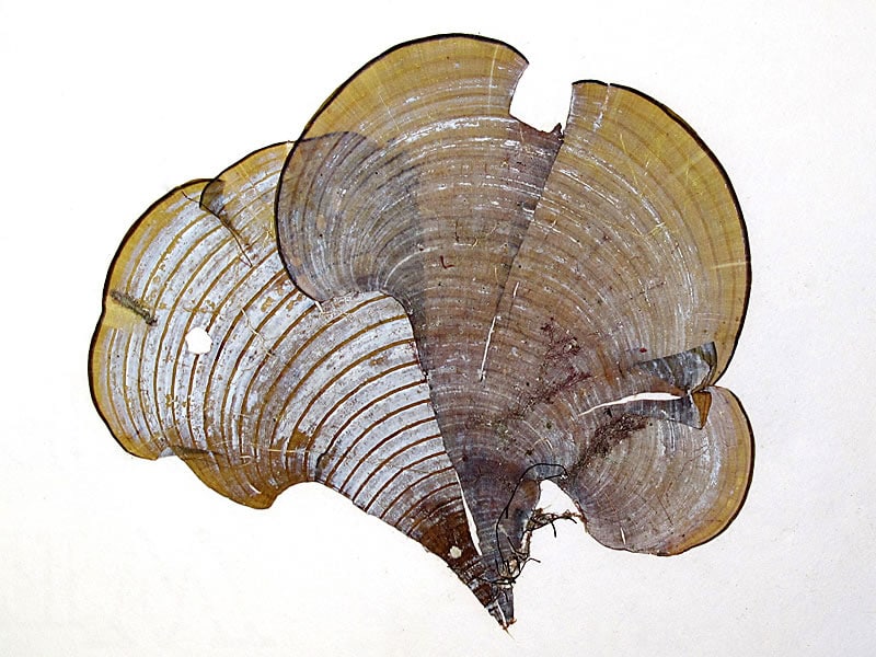 - The outer (under) surface has concentric rows of small, fine hairs and is banded with zones of olive green, pale and dark brown, while the inner (upper) surface is covered with a thin layer of slime.